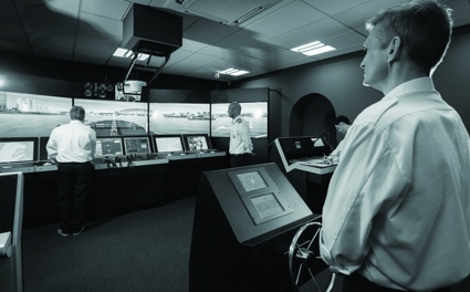 Integrated training: Teekay Gas’ KONGSBERG ship-handling simulator is next door to the new ME-GI training facility. The bridge features a K-Chief 700 ME-GI console that will be connected to the ME-GI trainer so what happens there, will affect what happens on the bridge.