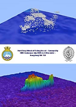 Immediately following the success of the International Festival of the Sea HMS ENDURANCE sailed to conduct trials on her recently commissioned ef designated EM710S. This is a state of the art system, at the leading edge of multi beam echo sounder technology and one of only two equipment at sea. The other is fitted in the Canadian Arctic icebreaking ship MATTHEW. Developed by the Norwegian commercial sonar specialists Kongsberg Maritime it has been especially designed to fit flush with our ice breaking hull. As can be seen from the accompanying image the results achieved are quite incredible, with this previously unlocated wreck being detected and readily identified in 130m of water.