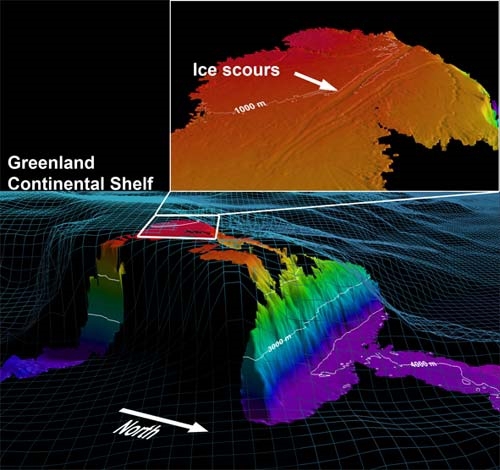 2007.09.02 - Amazing multibeam data: The northern plateau of Morris Jesup Rise was covered by more and more multibeam data as we criss-crossed with Oden to make occasional stops for a 360 degrees pirouette. Shortly after the data was acquired, post processing begun. The detailed image that emerged provided all information needed to locate some coring sites for different scientific purposes. We planned to take two cores in the largest iceberg scour so we could get material for dating the ice scouring.
