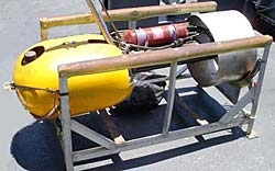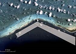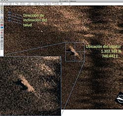 The search was undertaken over the area shown in the picture below based upon the aircraft's last known position and information received regarding local current and tidal conditions at the time of the crash. Due to the versatility of the side scan sonar it was possible to cover large areas of seabed using the low frequency (~100kHz) sweep whilst more detailed observations could be undertaken with the high frequency (~400kHz) setting after targets had been identified. A total of 30.5 km of survey lines were run, covering a swath of approximately 750 metres parallel to the coast as indicated. During the course of the survey two significant targets were discovered and one of them merited further investigation as it conformed to the shape and size of the missing aircraft.