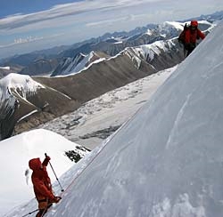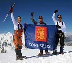 On the morning of Friday 7th August 2009, the team climbed for 7 hours up steep rock and scree slopes to a broad snowy ridge which led directly onto the summit of a beautiful mountain peak. Being the first known human beings to stand on the summit, the team decided to name the peak 'Kongsberg Peak' in honour of the premier expedition sponsor. Since then, the mountain peak's name has been registered with the Kazak and Kyrgystan mountaineering federation who have also confirmed that it was previously unclimbed. Handheld GPS readings taken on the summit show Kongsberg Peak's position as: