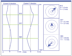 Graphical APOS view: Current measured by 3D current meaters at three water depths.
