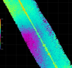 In the second pass, HUGIN followed the pipeline tracks identified in the first pass at low altitude and inspected the pipelines using the EM 3002 multibeam (now available as the more modern EM 2040) and the optical camera. After the mission, the recorded HISAS 1030 data was post-processed into high-resolution (4x4 cm) sonar images and bathymetry maps of the pipeline. Together with the optical images and the multi-beam data recorded in the second pass, this gave a detailed view of the pipeline surroundings and the pipeline itself. The complete procedure was repeated the next day over the second pipeline in a new 8-hour, two-pass mission.