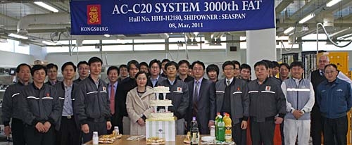 Kongsberg Maritime is delighted to announce Factory Acceptance Test (FAT) number 3000 for its highly regarded propulsion control system, AutoChief C20. The FAT took place March 8th 2011 at Kongsberg Maritime Korea's facility in Busan, South Korea, with representatives from Hyundai Heavy Industries (HHI) and a Lloyd's Register surveyor present.