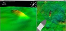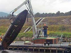 Detailed digital terrain models of the river bottom have recently uncovered some hidden secrets. A number of objects, possibly hazardous to navigation and undetected previously, have been removed from the channel. The data here shows the bathymetric image of a small vessel which was subsequently pulled from the river.