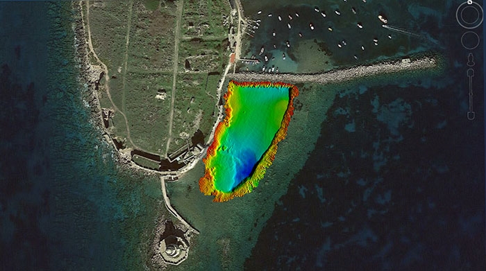 The research team used the Kongsberg GeoSwath Plus Compact bathymetric sonar, the Kongsberg GeoChirp sub-bottom profiler, magnetometer and side scan sonar for the shallow water hydrographic and geoarchaeological investigation. Methoni’s ancient submerged pier and harbour (fig.1), a number of historical shipwrecks and artefacts (fig.2), as well as ruins of the submerged prehistoric town were recorded in 2D and 3D.