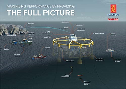 As a partner in the newly established SFI Exposed Aquaculture Operations managed by SINTEF, Kongsberg Maritime can provide a range of various systems for aquaculture, such as different types of sensors and echo sounders for real time visualization of fish distribution in order to monitor such factors as fish behaviour, size distribution, activity levels and position. Kongsberg Maritime also offers several other systems for fish farms, such as automation, navigation and communication systems for data transfer to shore.