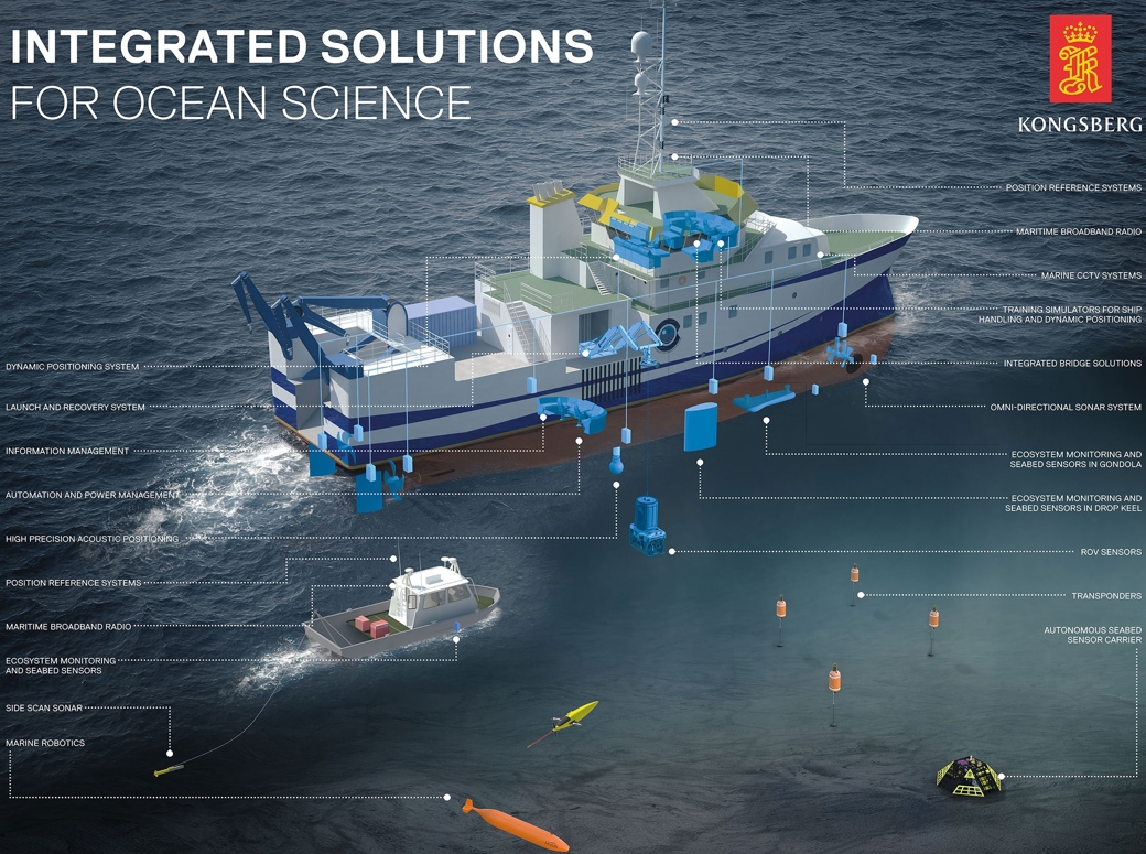 Integrated Solutions for Research Vessels takes the Full Picture to the next level. For research and surveying applications, KONGSBERG integrates the widest range of multibeam and single beam echo sounders, sonars, Marine Robotics systems (i.e. AUV) and position reference systems available from a single supplier. In addition to marine and subsea specific technology, The Full Picture strategy also supports vessel designers, shipyards at the procurement and engineering phases, and owners/operator with single source service and support throughout the life-time of a vessel. This significantly reduces the amount of suppliers in the chain, resulting in streamlined vessel construction, and effective support during operations.