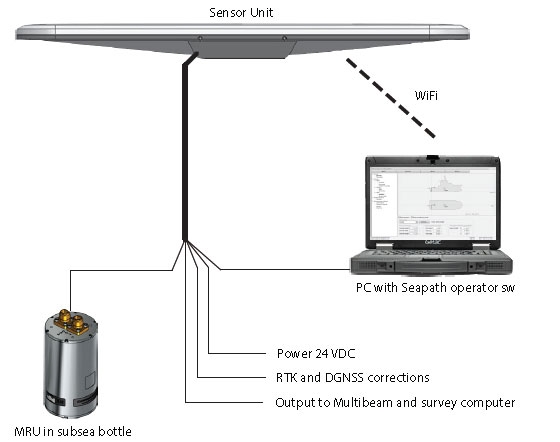 The main component of Seapath 130 is the Sensor Unit with integrated GNSS antennas and receivers. The Sensor Unit mounts on top of the vessel mast or a pole. On top of the transducer, the inertial sensor (MRU H, 5 or 5+) is mounted in a lightweight subsea housing, while the Seapath operator software is installed on a connected PC for configuration and monitoring. All components are connected through a spider cable with MRU connection, three configurable output serial lines, DGNSS correction input, 1PPS output, network communication and power. Seapath 130 products have three configurable RS-232/422 serial lines and Ethernet for output of motion data and NMEA messages to the multibeam and survey computer. Input of DGNSS corrections of various quality and sources are on a configurable RS-232/422 serial line or Ethernet.