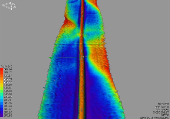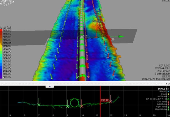 The M3 Sonar® is highly suited to ROV operations as it is capable of both imaging and profiling, and has a small size for ease of installation. It is a major cost saving compared to larger, lower frequency ROV mounted multibeam systems. The M3 Sonar® is also easily interfaces to 3rd party acquisition packages. A pair of Kongsberg Mesotech M3 Sonars were supplied through the rental company Seatronics, and mounted on the ROV in dual head configuration. The M3 Sonars were then used to run a profiling survey over the LNG pipeline, which was logged in EIVA Naviscan acquisition software by the survey team.
