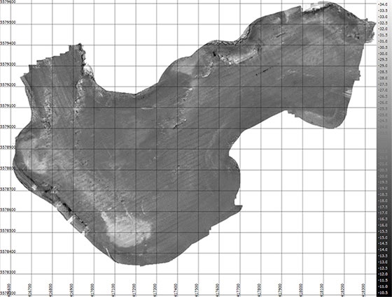 During data processing, using the latest release of the GeoTexture software, specifically developed algorithms account for sonar calibration information, range and absorption in the water column, transducer directivity, vessel movement, angular backscatter response and the slope of the seafloor. The result is a map of the seafloor showing the backscatter response for the given sonar frequency in absolute dB values.