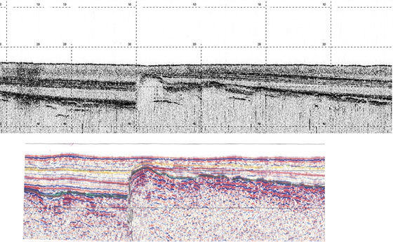 ToPAS data (top) compared to Boomer multichannel data (with hand annotation) over a known sub-surface feature.