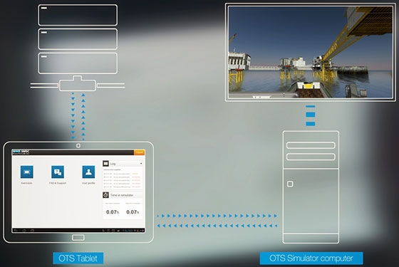 With the OTS concept, the vessel is controlled in a normal manner by a deck officer on the bridge, either by the use of manual controls or by the use of Dynamic Positioning (DP). The vessel's motion and position in the virtual world is calculated based on input from the vessel's navigational aids (minimum GPS and Gyro) and shown on a dedicated screen. While the vessel is actually in safe, open waters, the virtual world can contain imaginary objects and installations (such as rigs, buoys, piers, etc.) shown on the screen. Using this setup, the DP operator can simulate approach to a platform or other installations, docking the ship at any port, navigating in narrow and constricted waters, and various other operations.