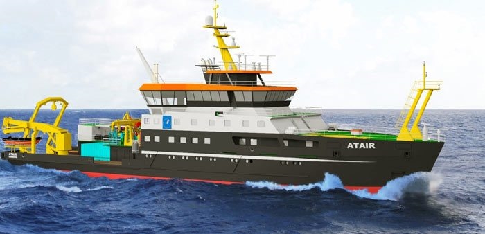 Atair II will feature a large working deck including laboratories, an air pollution measurement station, a working crane and a scrollbar for geological work on the sea floor. The 200-square-metre free working deck offers space for laboratories and transport containers and an extensive diving equipment and diving Chamber are also included. For Atair II's primary tasks of hydrographic survey and wreck search, KONGSBERG will supply a substantial suite of the most sophisticated hydrographic survey equipment including multi/single beam echo sounders, sonar, sidescan sonar and sub-bottom profiler.