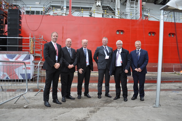 Kongsberg Maritime at the ceremony today (from Left): Jostein Sandøy Services System Project Manager; Lars Alv Haugen - Contract Manager; Stene Førsund - Senior Vice President Sensors & Robotics, Sales; Einar Vegsund - Ship Design Manager; Egil Hausdal – President; Keith Tyler - UK Sales Manager