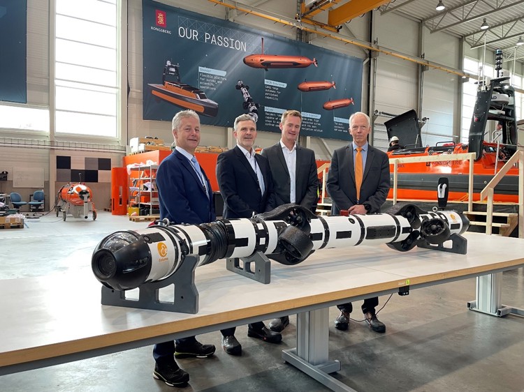 Argeo has signed the first commercial contract for Eelume’s snake robot technology. From left: Atle Gran, Kongsberg Maritime; Trond Crantz, Argeo; Thomas Nygaard, Kongsberg Maritime; Morten Bjerkholt, Eelume