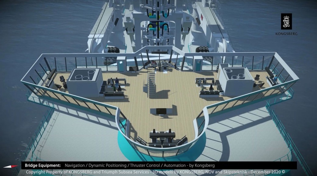 Triumph Subsea Services founder and COO Gray Johnstone said: “We are very excited to have been working with KONGSBERG from the initial conceptual stages and to have incorporated the KONGSBERG suite of equipment and systems. This has enabled us to achieve a game-changing vessel with the smallest possible environmental footprint, whilst ensuring maximum operability and safety for our people and the environment.”