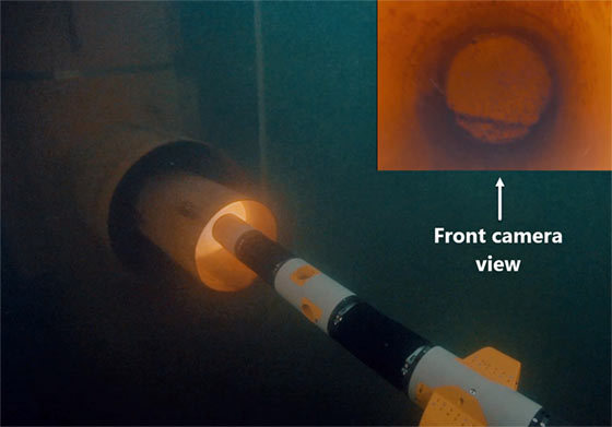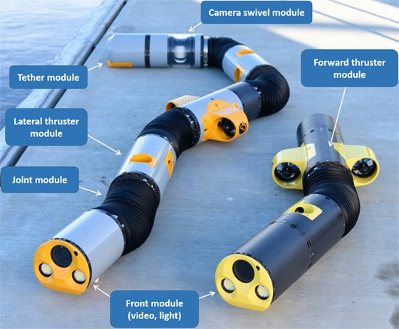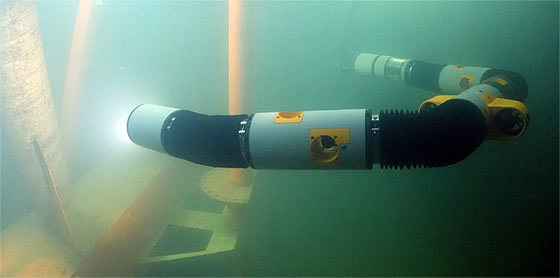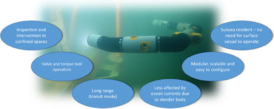 The shape-changing capability allows the vehicle itself to act as a robotic arm. The flexible body and narrow cross-section provide significant advantages over existing ROVs, including the ability to perform IMR in constrained locations of subsea installations where existing ROVs are too large to gain access. During inspection and intervention tasks, the vehicle can hover by means of ducted lateral and vertical thrusters installed along the flexible body.