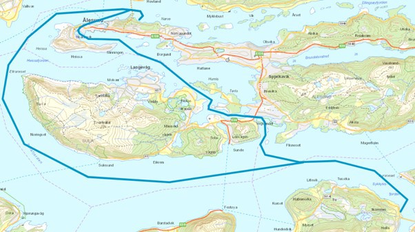 Map: The two main routes either through Vegsundet and inner Harbour, or out in Breisundet where the vessel is more exposed to wind and weather.