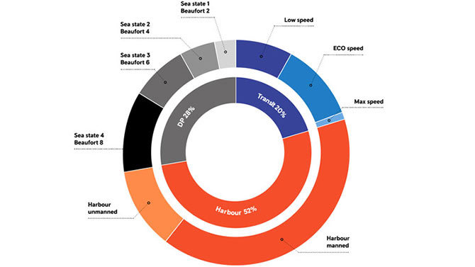 A broad breakdown of the operating profile for the NCA vessels showed that 28 per cent of the time is spent in DP mode, 20 per cent in transit and 52 per cent in a harbour. To allow the parameters for the integrated hybrid system to be set correctly, a much more detailed analysis was made.