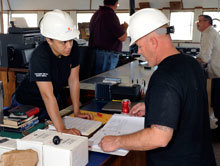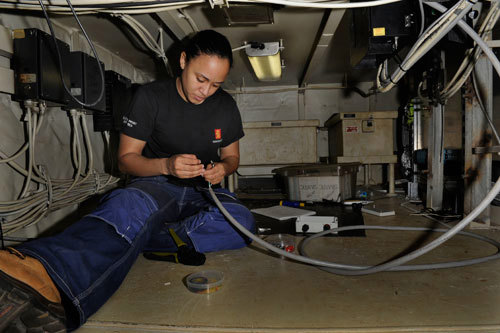 HANDY WOMAN: Jessica likes working with her hands. In the photo above, she is completing the signal cables in the crawl space under the pilothouse.