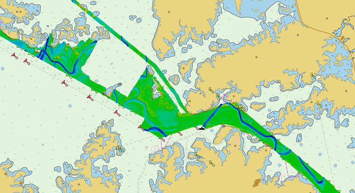 The average depths in the current working areas range from 16.76m to 18m. The wide swath coverage of the multibeam systems allows to cover the 200m width channel areas with very few survey lines, which includes mapping the foot of the slope on both sides of the navigational channel; the latter is a very important task for inspection purposes to detect bottom scour, slope failures or also massive slumping of seafloor.