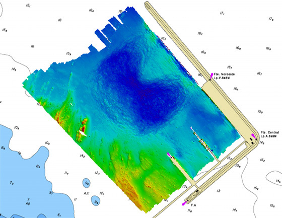 To survey the area, the boat had to run several lines, using the EM 2040 to acquire data from the seabed, creating a precise and reliable image of the area's topology. To have this survey approved, it is very important that the data matches perfectly every time the system overlaps the swath on different lines. This is especially tricky in harbour areas, where the water's properties can change very quickly and the tide can vary meters during the day. There are also position interferences next to huge vessels alongside the harbour. To solve these issues, sound velocity profiles were measured constantly, and a tide sensor station was installed inside the Port, to post process the raw data from the EM 2040. Also, the harbor's administration was very helpful on removing vessels to help the survey.