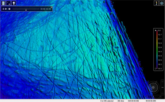 To survey the area, the boat had to run several lines using the EM 2040 to acquire data from the seabed in order to create a precise and reliable image of the area's topology. To ensure that the survey met the required standards, it was important that the data matches perfectly every time the system overlaps the swath on different lines. This is especially tricky in harbour areas, where the water's properties can change very quickly and the tide can cause the water level to vary by metres during the day. Additionally, large vessels and dockside structures can create interference for the position reference systems. To solve these issues, sound velocity profiles were measured constantly, and a tide sensor station was installed inside the port to post process the raw data from the EM 2040. The harbour administration was also very helpful in managing vessel traffic during the survey.