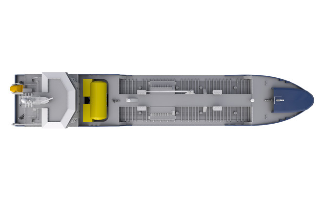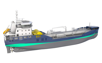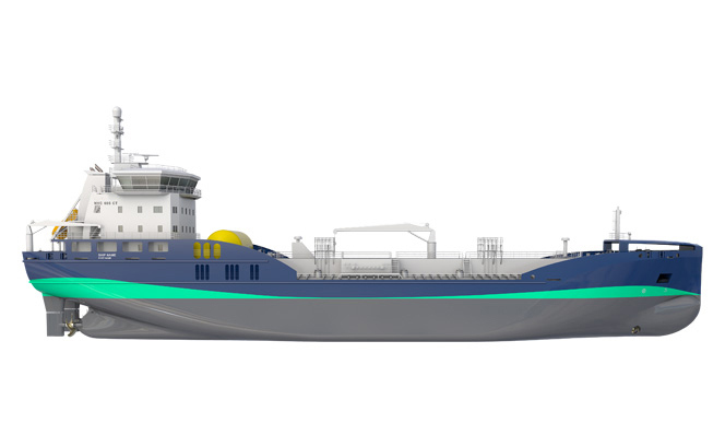 NVC 605 CT is a 5,300 TDW tanker for transporting chemical and petroleum products, IMO II. The smaller of our two tanker designs, this vessel features stainless steel cargo tanks with a cargo capacity of 6,400 cu.m, equipped with a closed deck trunk and deep well cargo pumps. The propulsion system is based on twin azimuthing gas mechanical driven pulling propellers with a service speed of 14KN. It has been designed with a high focus on sea-keeping performance, redundancy and safety. The NVC 605 has a 3,000 NM endurance without refilling.