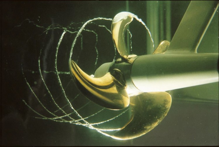 Cavitation is generated when the pressure in the water around a propeller blade becomes lower than the water’s vapour pressure. The water is then broken up into cavities, or cavitation bubbles.