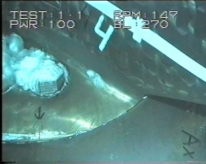 On the blade at the top position there is a sheet cavitation, which is caused by load variations on the blade during the propeller rotation. Theses variations care caused by variations of water velocities coming into the propeller disc due to disturbances from the hull and shaft line.