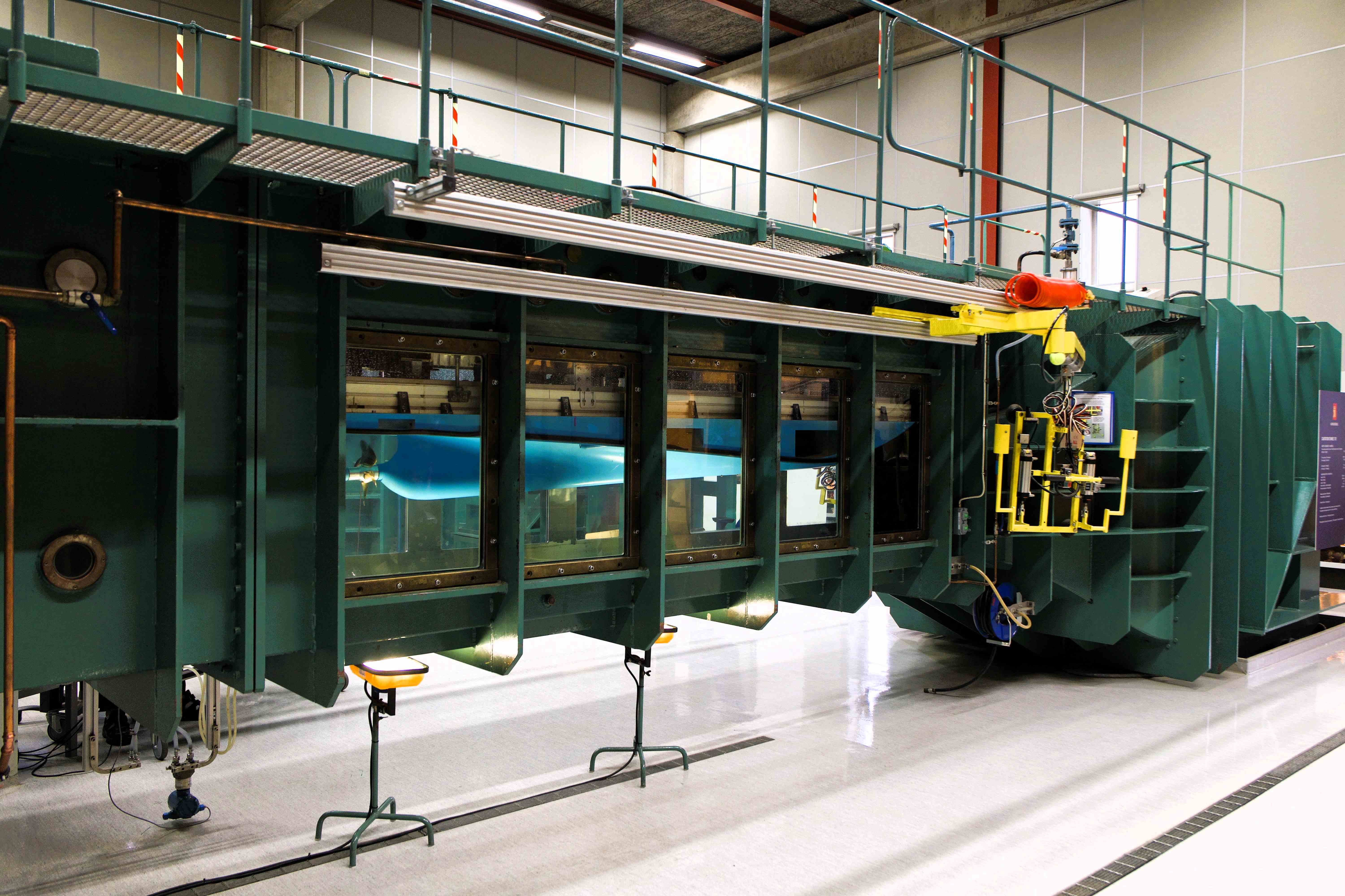 A schematic of the Cavitation Testing Tunnels used by the HRC The free surface tunnel is used for testing propellers in partially or fully submerged conditions behind a hull dummy. This allows verification of water flow around the hull and into the propeller. This tunnel is suited for testing waterjet units as a complete system with inlet, pump and steering/reversing unit as well as hydrofoil configurations.